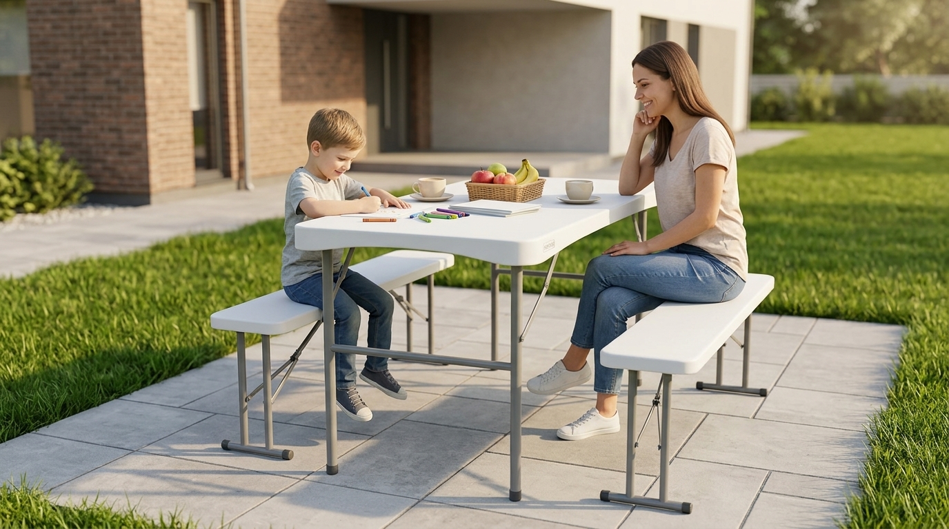 Plastové sety stôl + 2 lavice sú ideálne na každodenné používanie. Vynikajú najmä: