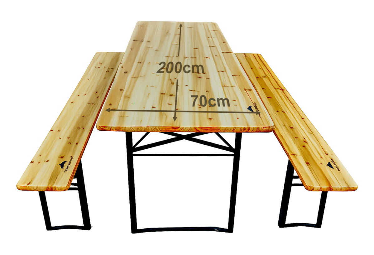Dosky stola aj lavíc sú vyrobené z masívneho dreva čínskej jedle s hrúbkou 3 cm, ktoré sa vyznačuje prirodzenou kresbou, pevnosťou a dlhou životnosťou. Povrchová úprava odolným lakom chráni drevo pred vlhkosťou, dažďom, slnkom aj mechanickým opotrebovaním. Vďaka tomu je pivný set vhodný na vonkajšie aj vnútorné použitie.